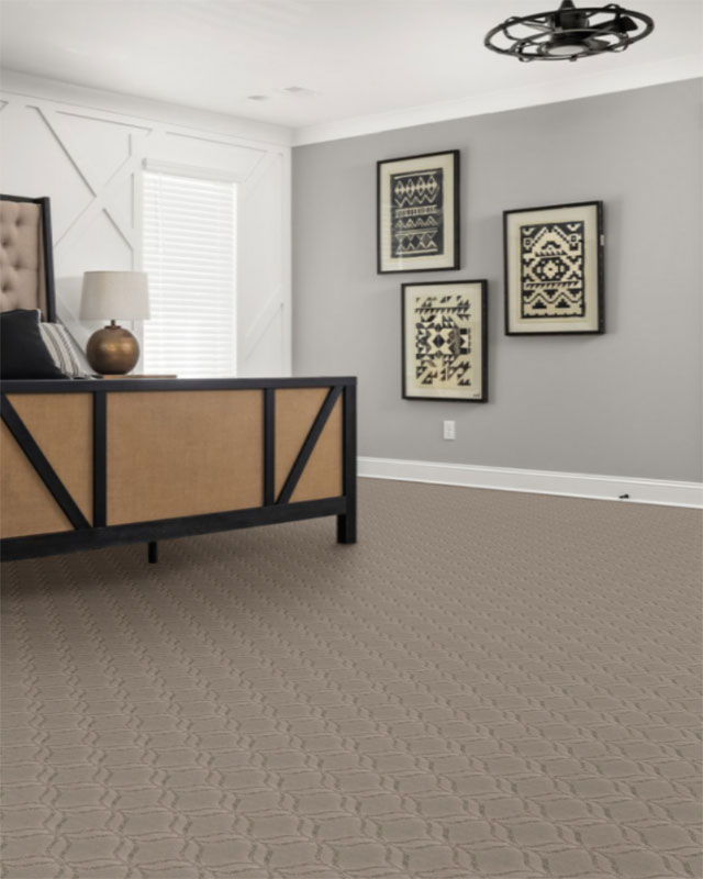 This year, bolder carpet patterns and styles are on the rise when it comes to top flooring trends. Making a statement with carpet is the perfect way to elevate a home’s style and appearance, and there’s no better way to do that than with a pattern or unique color. Try multi-dimensional octagons, squares, or lattice for a more modern look, or go simple with curved lines. For the perfect combination of pattern, color, and softness, check out the beige carpet pictured below (top). The arabesque shape achieves a trendy appearance for a flooring product that will wow any guest. Plus, its neutral color checks the box for our neutral carpet color trend, too! Not looking to go too over the top but still want a unique look? Try a bolder, darker neutral, like the carpet pictured below in a deep gray color with flecks of lighter fibers. It would surely add a moody, one-of-a-kind element to any space.