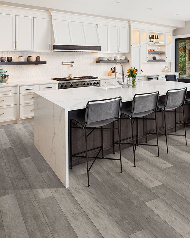 Lastly, rounding out our collection of gorgeous natural graining and distressed wood-look flooring is a wood-look, waterproof luxury vinyl shown below. More of a worn, barn wood gray tone, this luxury vinyl will prove to be a top choice for its trendy style and timeless appearance.